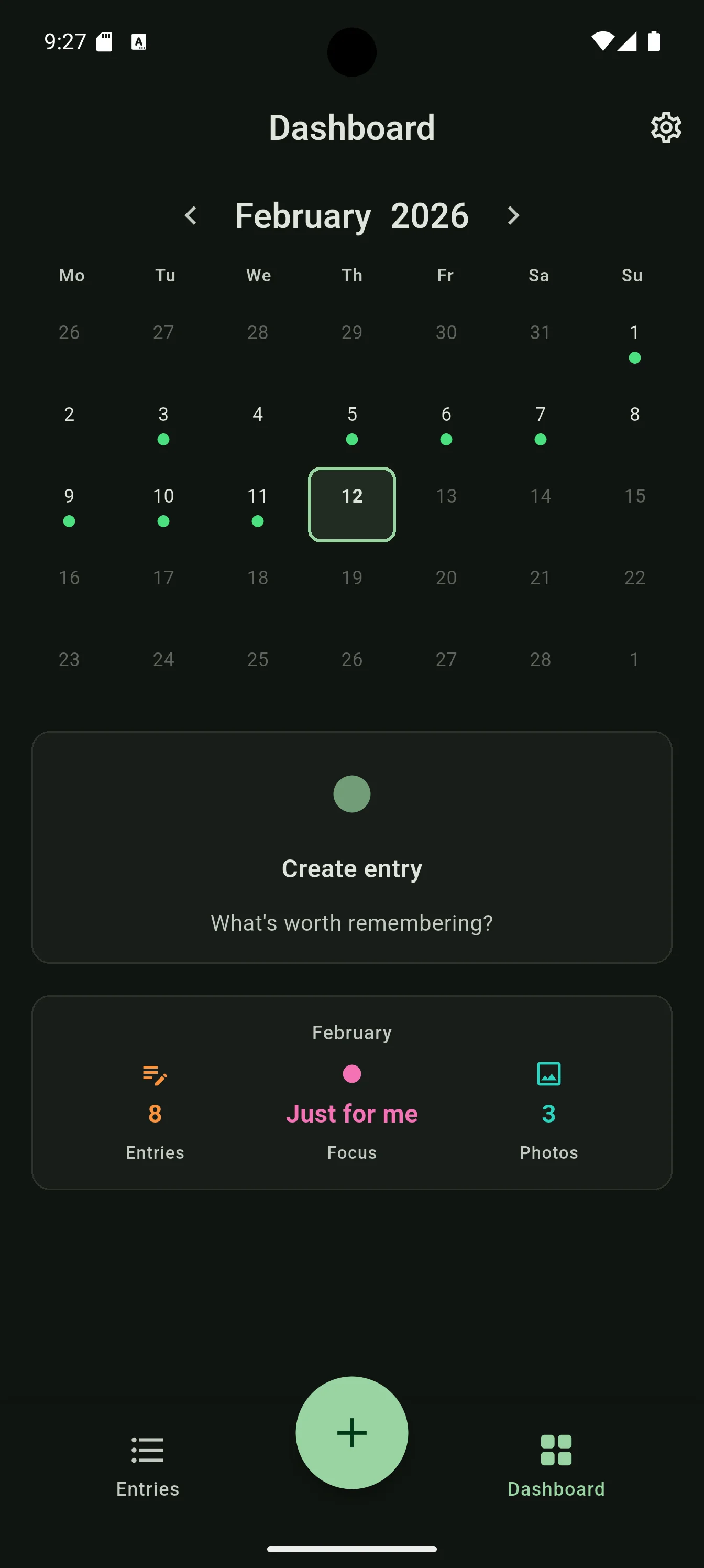 - Daily entries with photo, rating & focus tag